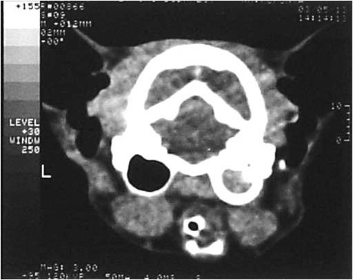 a CT, így számos betegség megállapítható. Különösen a kistestű fajtákban gyakori agyvelővízkór (2. ábra), és a más fajtákban is előforduló agydaganatok (3.ábra) egy része állapítható meg nagy biztonsággal.